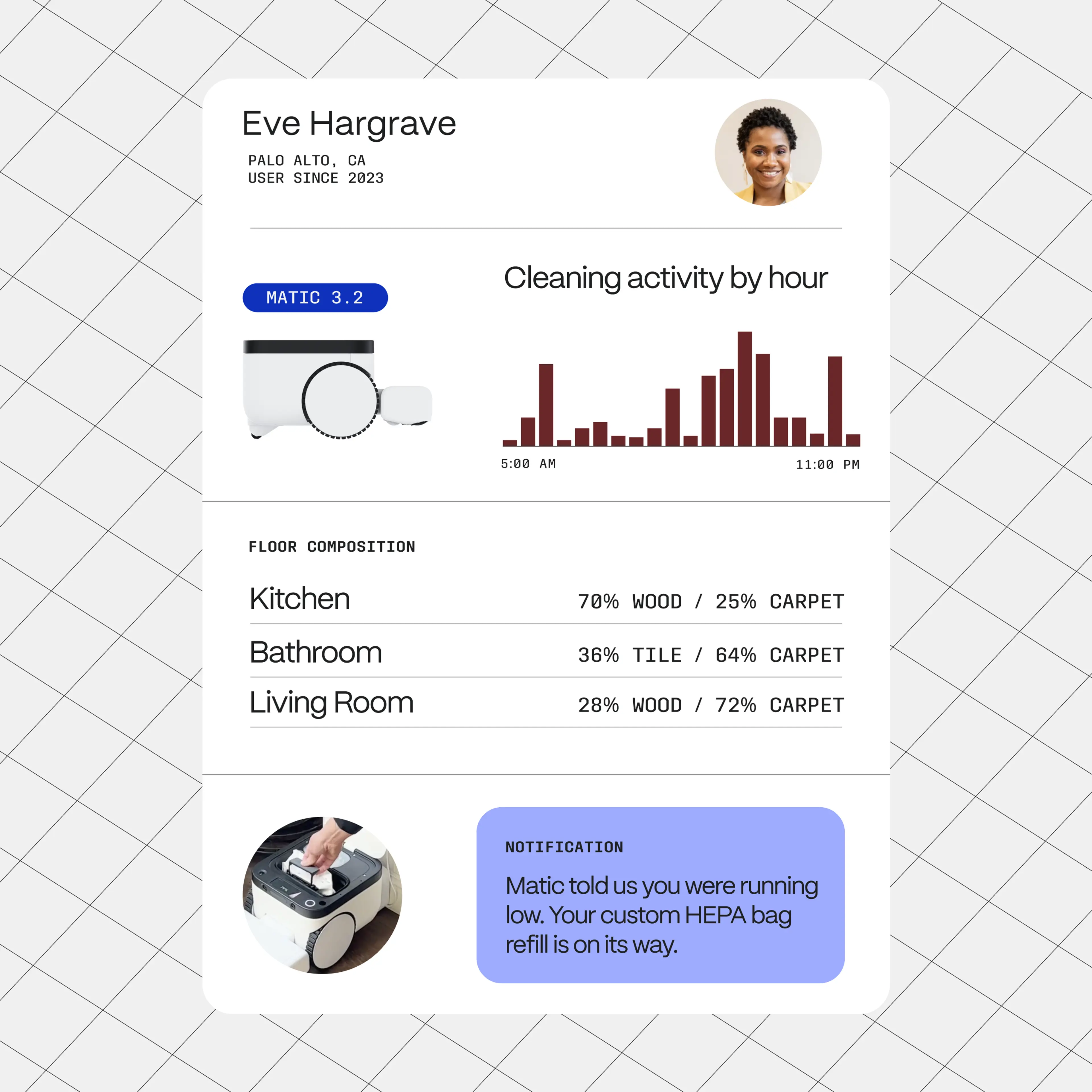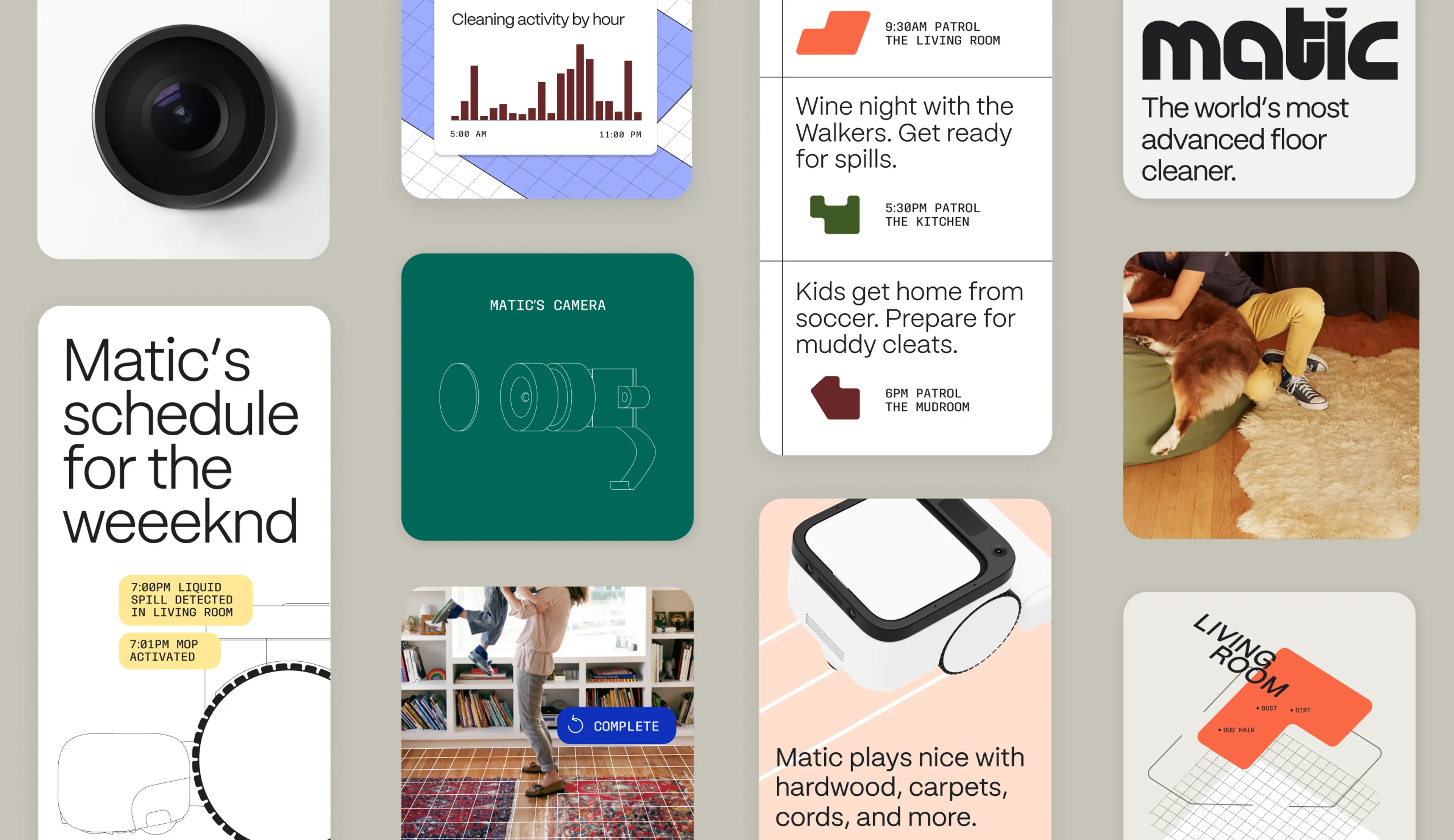 When robot vacuums first debuted in the 1990s, they promised a home cleaning revolution. 30 years later, functional issues as basic as rolling over carpet continue to make floor crawling robots more of a punchline than a timesaver. Enter Matic. Developed by former Google and Nest engineers, Matic robots set a new standard for autonomous floor cleaning. Matic harnesses the power of AI and computer vision to assess wet and dry messes, auto-toggle between mopping and vacuuming functions, and move seamlessly from room-to-room and mess-to-mess (no adult supervision required). Our brand idea “Perfect is Always in Progress” speaks to both Matic’s always-on patrolling and the company’s dedication to continuous innovation in an often-overlooked setting–-our homes. Our brand world celebrates Matic’s path, intelligence, and approachable elegance. From visual and verbal identity to site design and content creation, our work makes Matic the most covetable household innovation yet, and your home’s best helper.