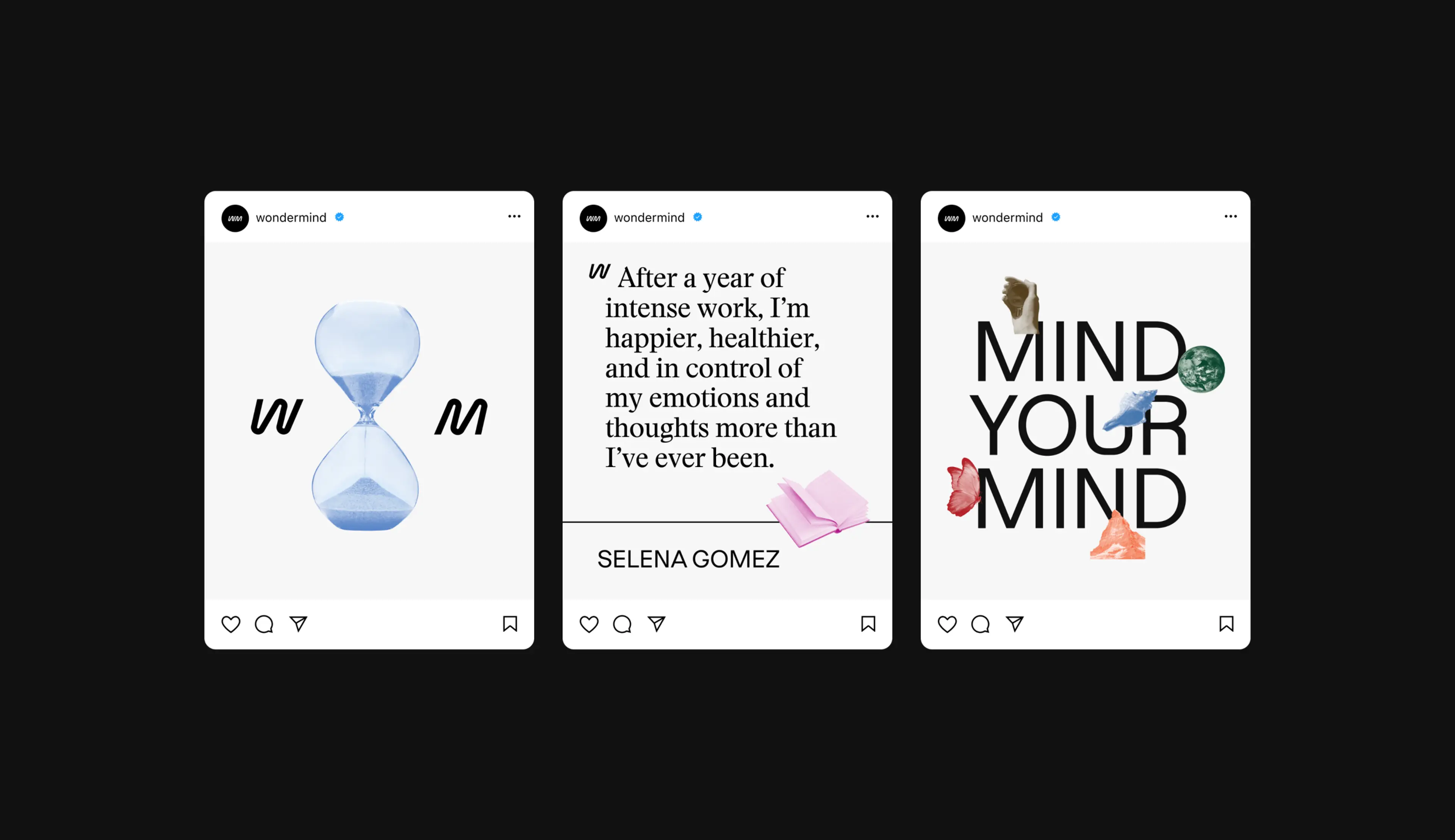 Based on their own struggles with mental health, Selena Gomez, Mandy Teefey, and Daniella Pierson set out on a mission to position “mental fitness” as an essential daily practice. Our task was to build a world for Wondermind that set a completely new tone for this very misunderstood space. Wondermind’s content aims to destigmatize mental health, so we created a brand system that blends intrigue and approachability, encouraging readers to deep-dive into a plethora of daily resources without feeling overwhelmed. We created an ownable image treatment that allows for daily updates, and implemented a feature for browsing content based on mood. The W and M from our wordmark become quotation marks, demonstrating that Wondermind is reframing the conversation around how we show up for our mental health—everyday.